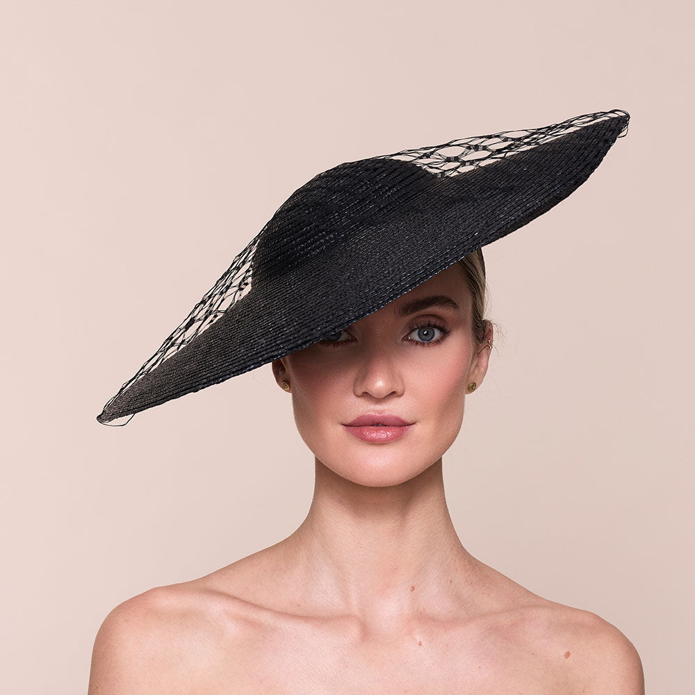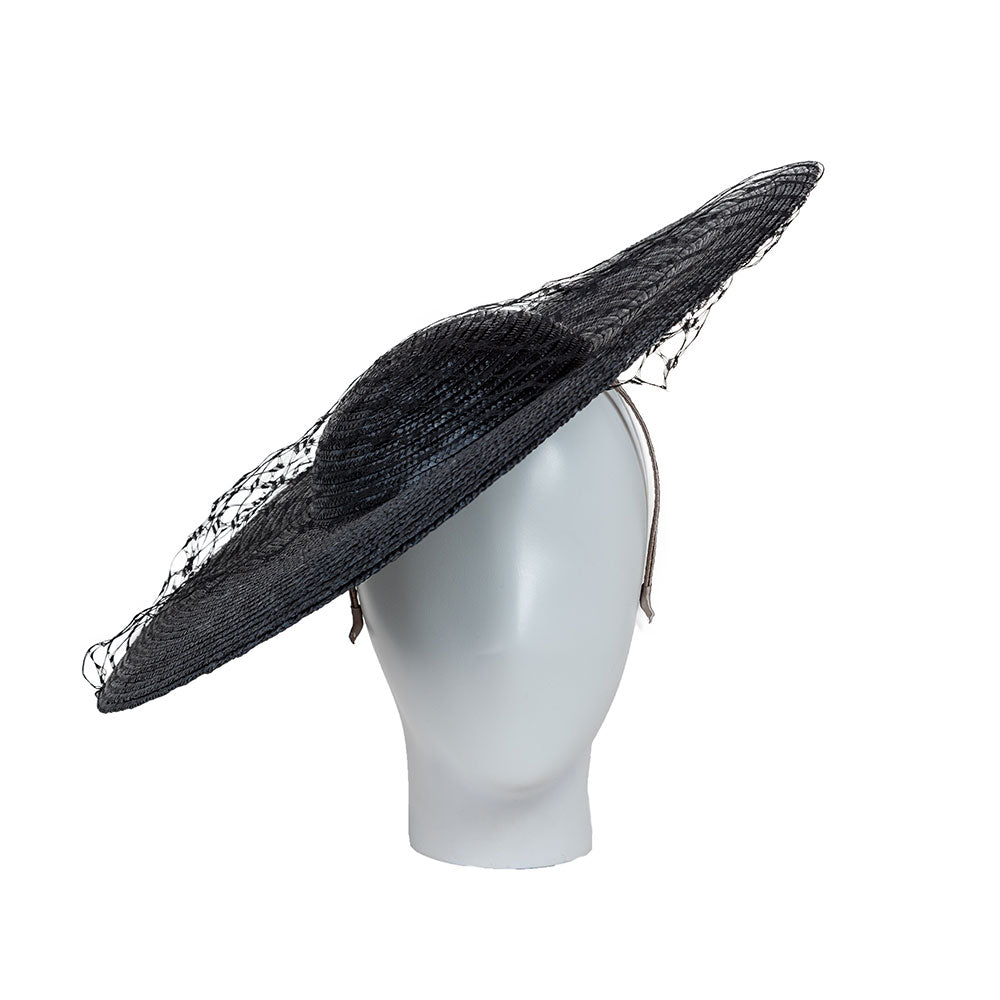 A vintage style straw disc design with a chic, minimal trim of black veiling.