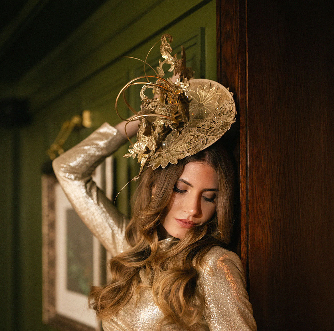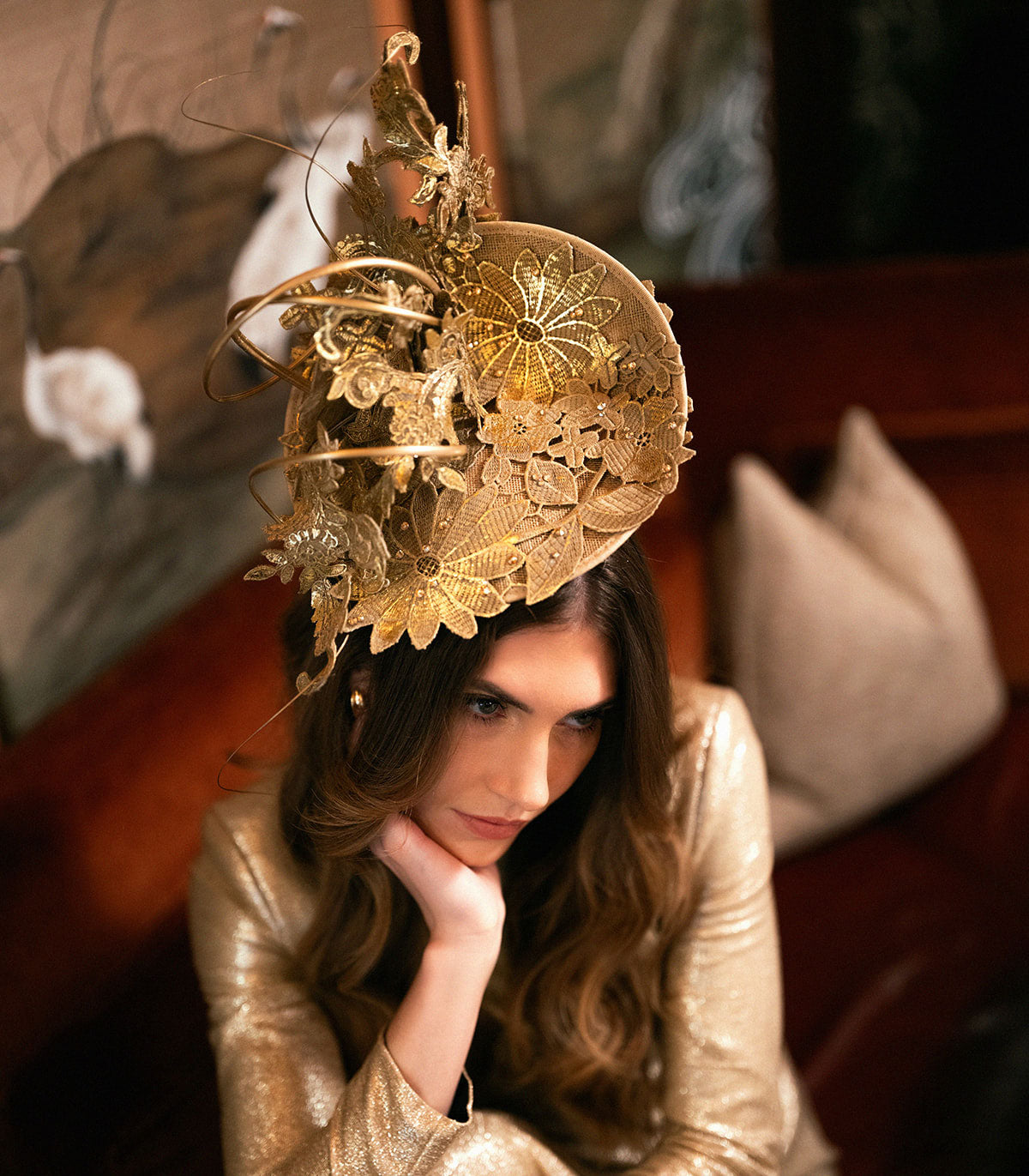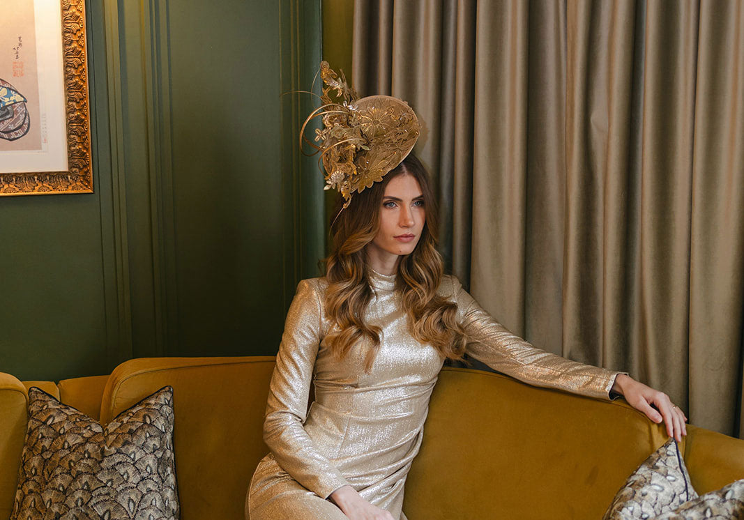 This exclusive, one-off style features a Royal Enclosure-approved disc covered with floral design blocked lace. Lace applique and hand-curled ostrich quills swirl up from the base to create an elegant yet striking trim. This piece is finished with sumptuous gold leaf and sparkling Swarovski crystals.