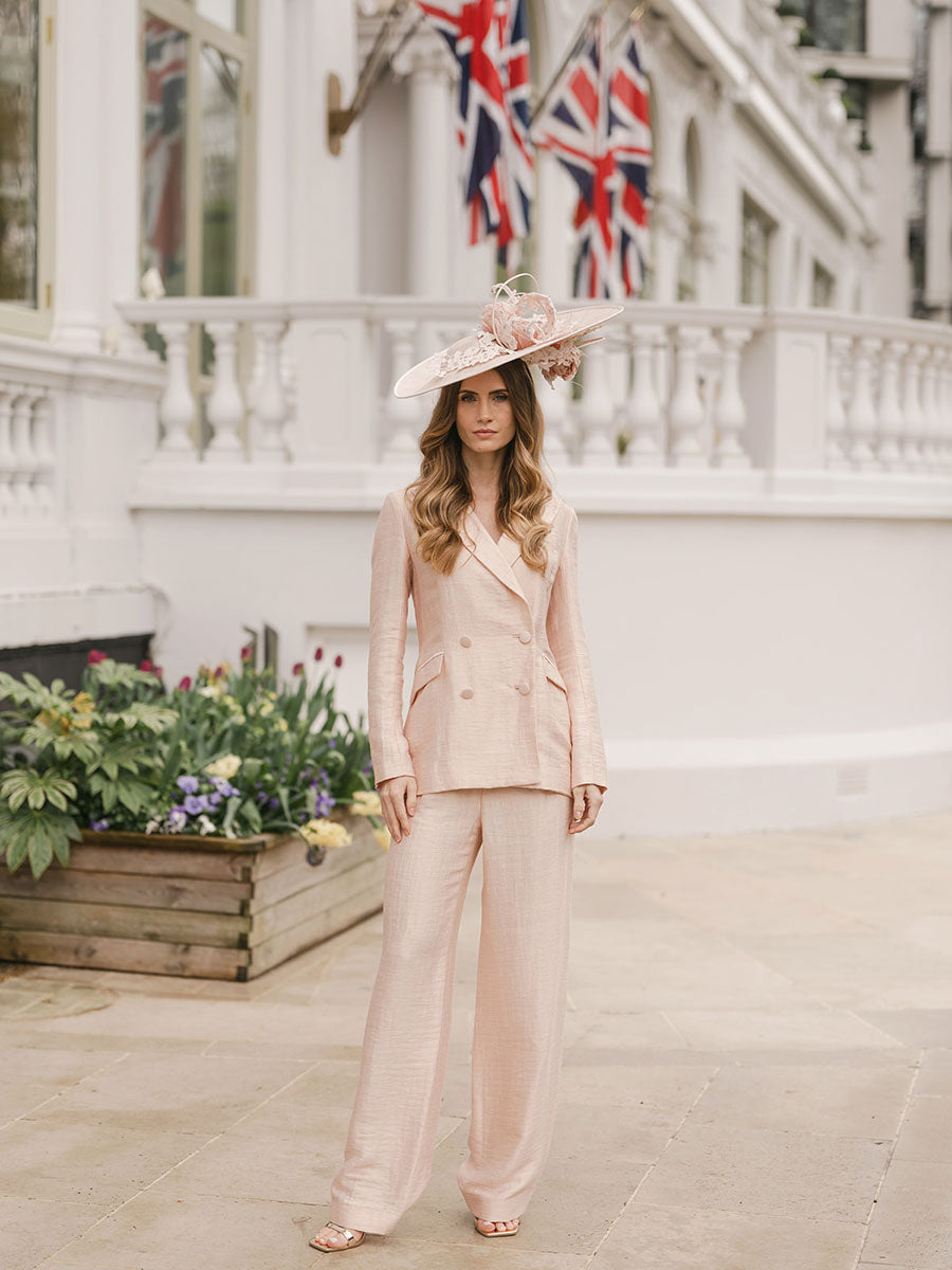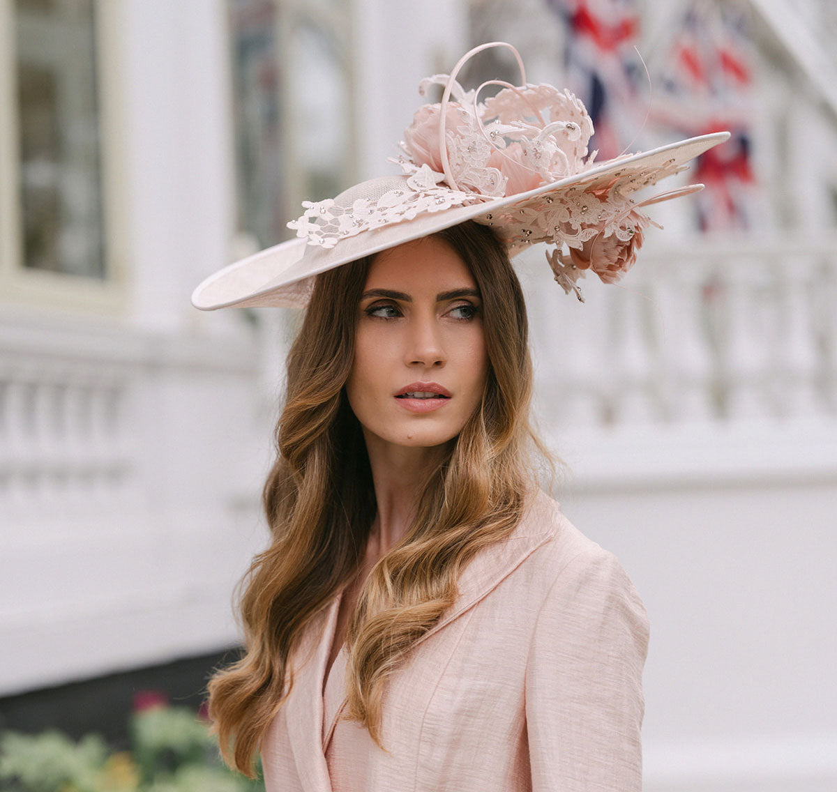 This one-of-a-kind design is feminine yet striking. Blocked floral lace appears to float across the blush pink base of this large disc style. Twists of lace applique form an intricate trim, with feather peonies and hand-curled ostrich quills adding a beautiful finishing touch. Encrusted with shimmering Swarovski crystals to truly sparkle in the summer sun.