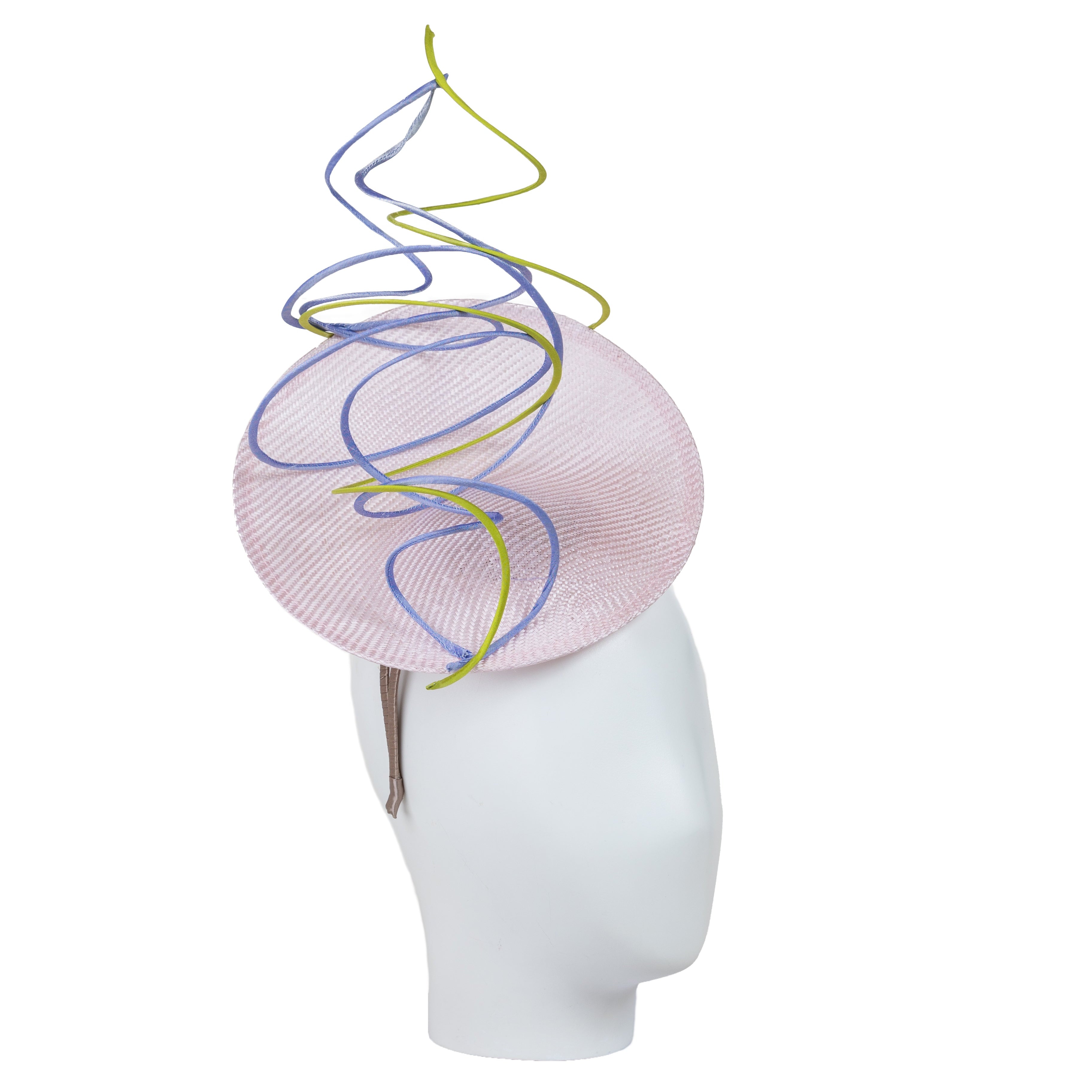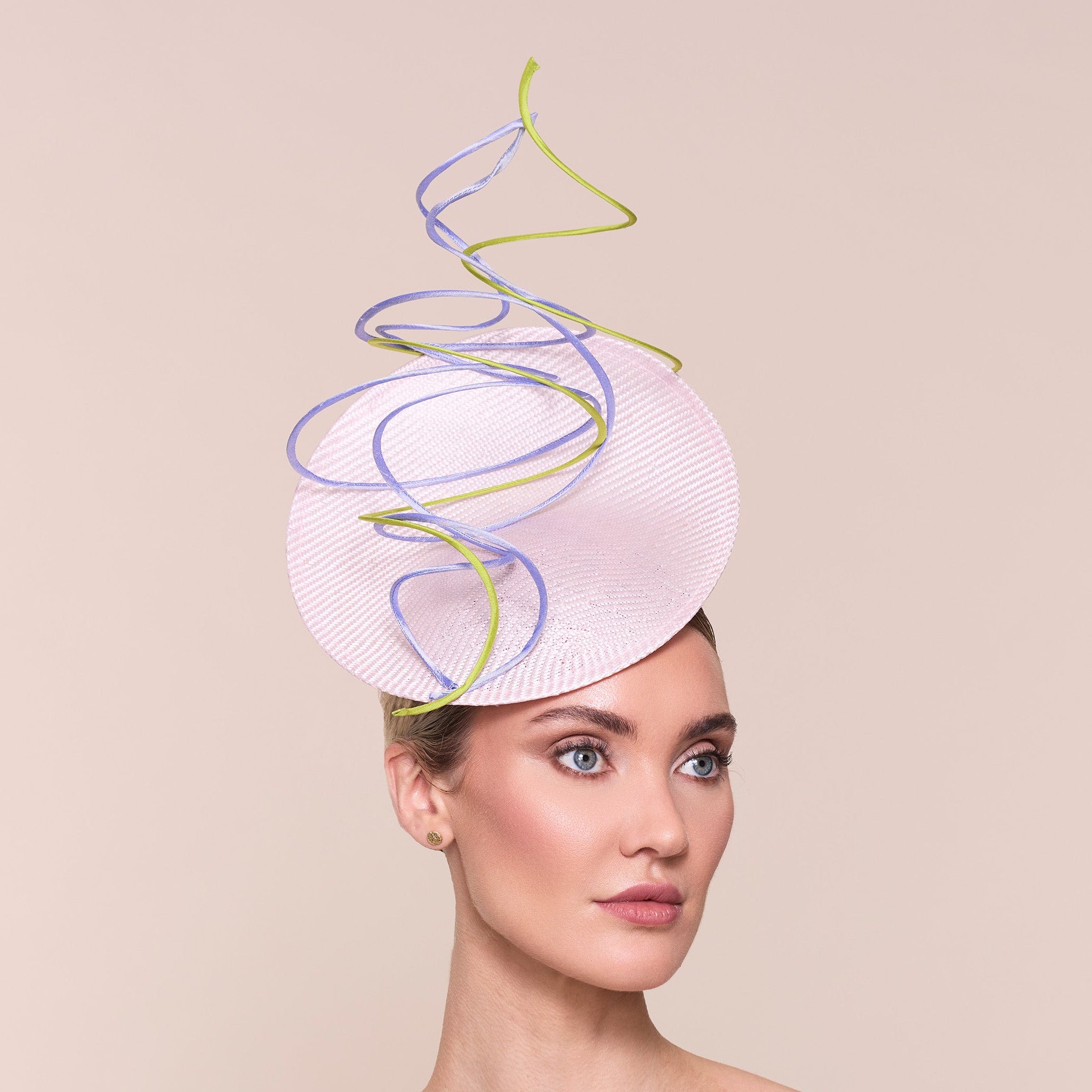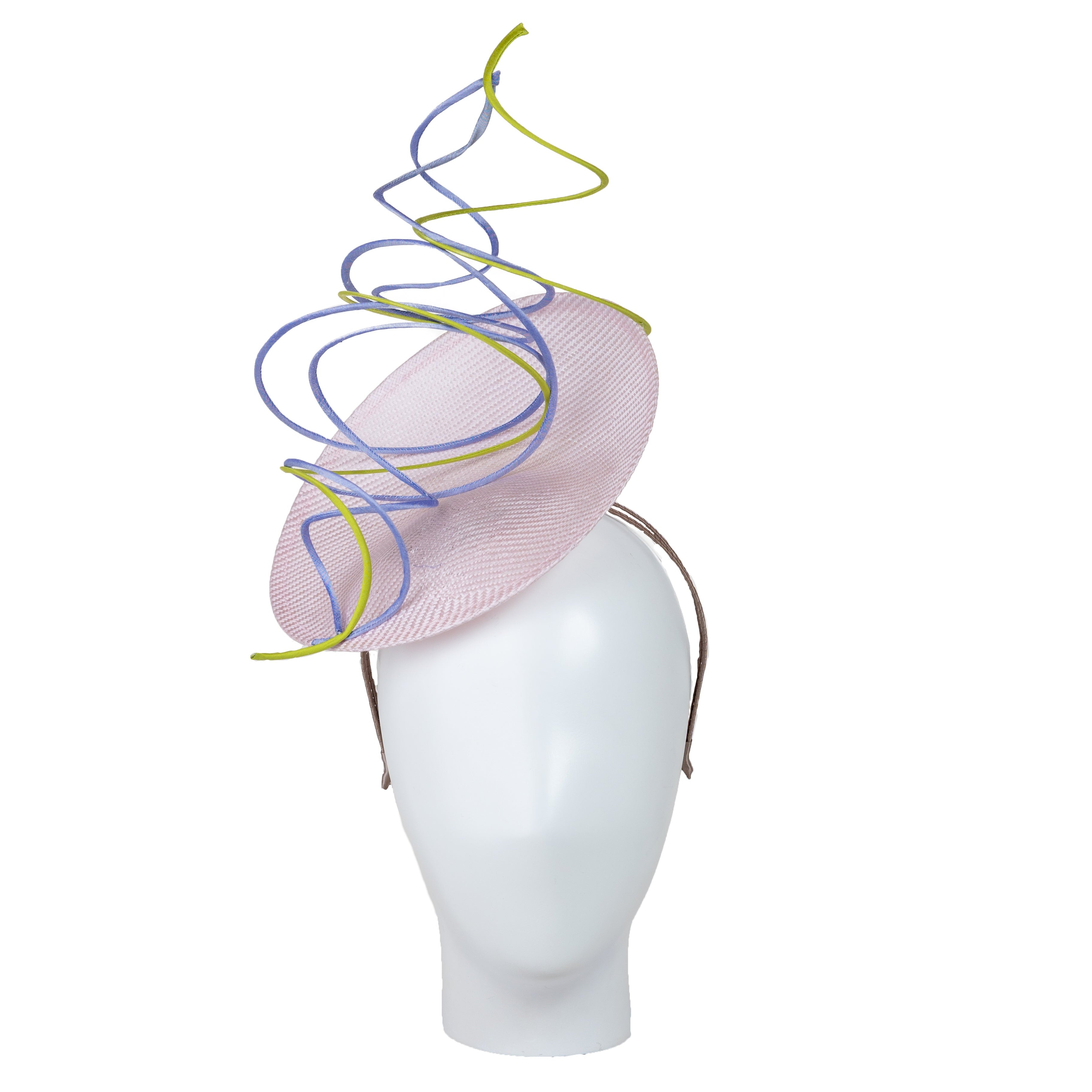 A small sisal blocked base, trimmed with delicate spirals of wired silk in mixed tones of lime and lilac. Lightweight yet statement, this headpiece is perfect to wear all day - whether you're at Royal Ascot, Kentucky Derby, a special wedding, or garden party.