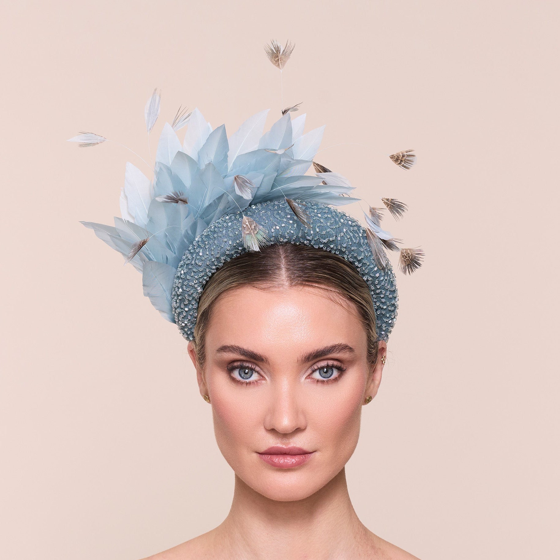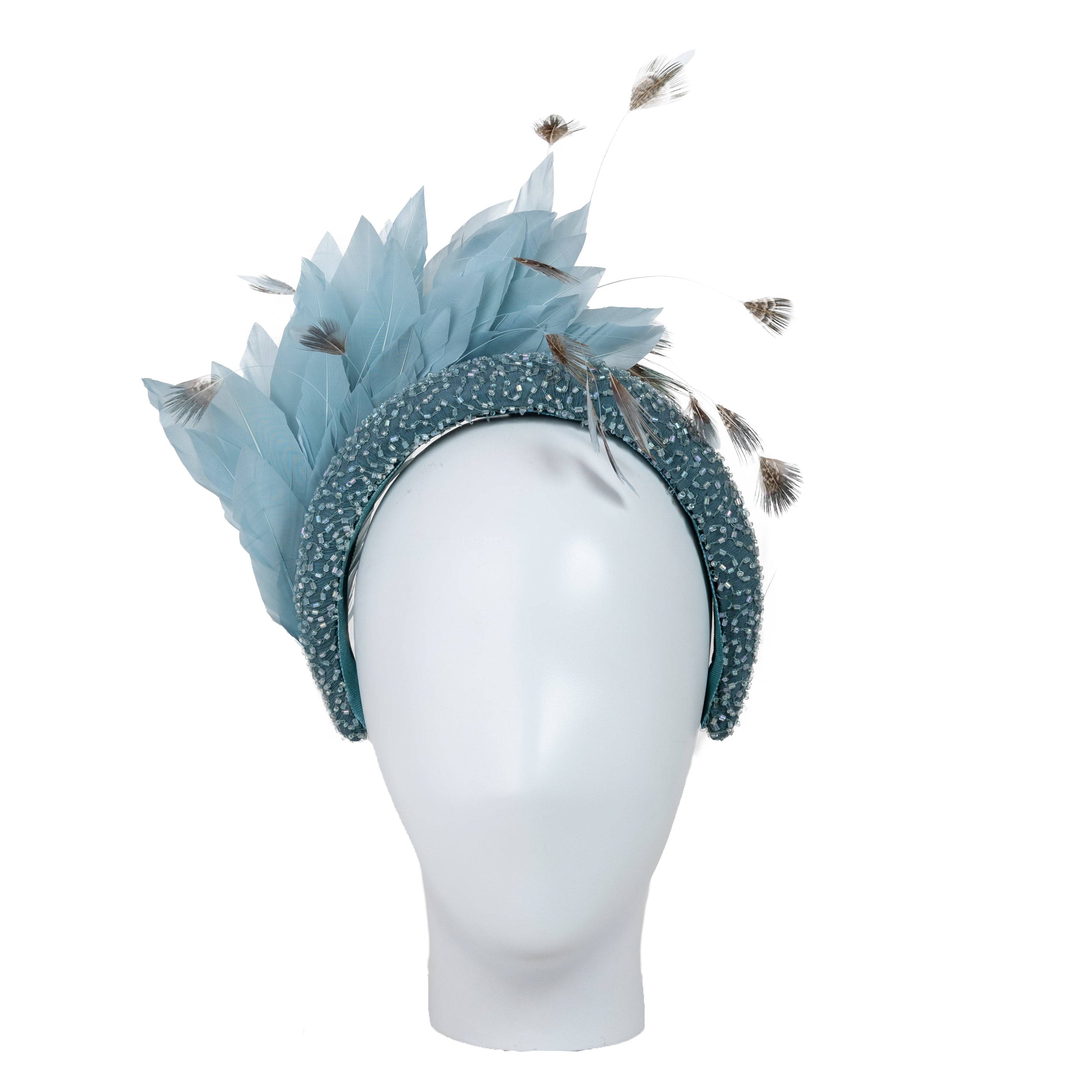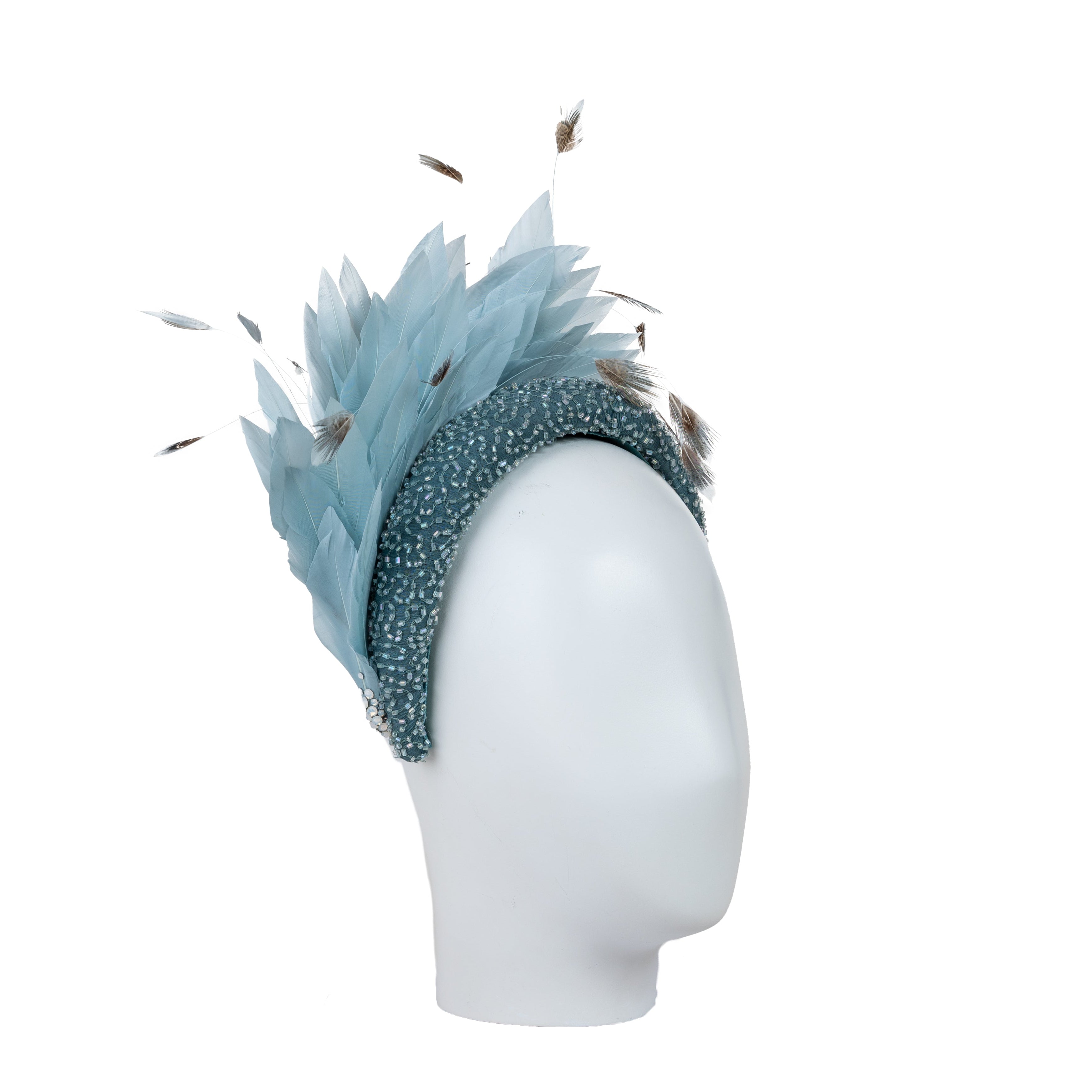 An oversized headband style featuring a padded band, overlayed with luxurious beaded chiffon. Trimmed with a plume of tonal goose feathers and finished with a scattering of long coque feathers, tipped with patterned plumage as an extra little detail.