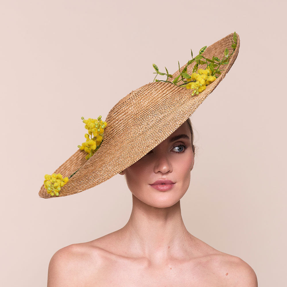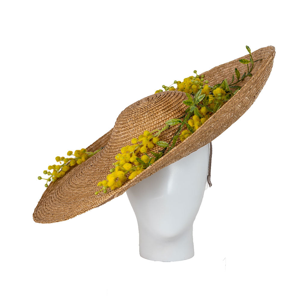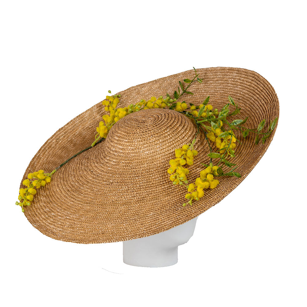 Our largest straw disc design, trimmed with delicateflocked mimosa blossom in yellow.