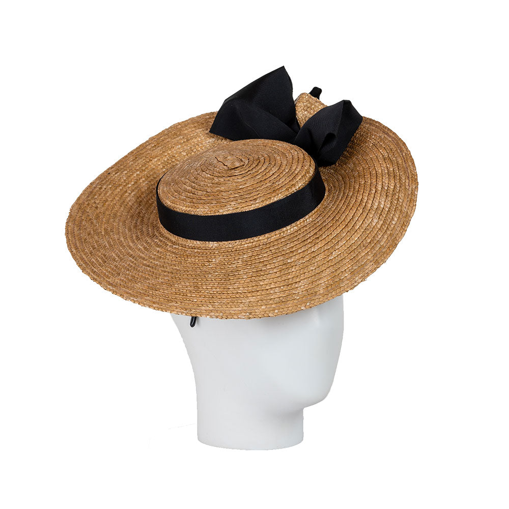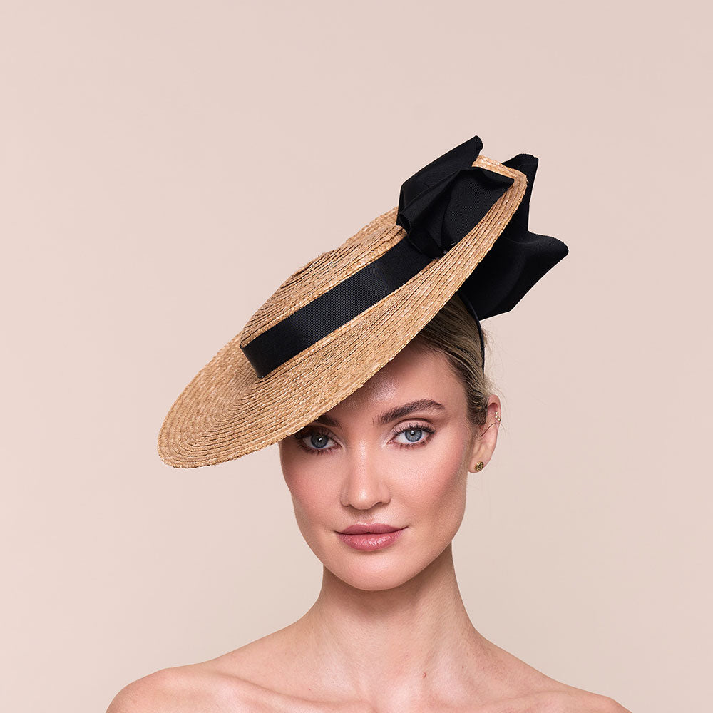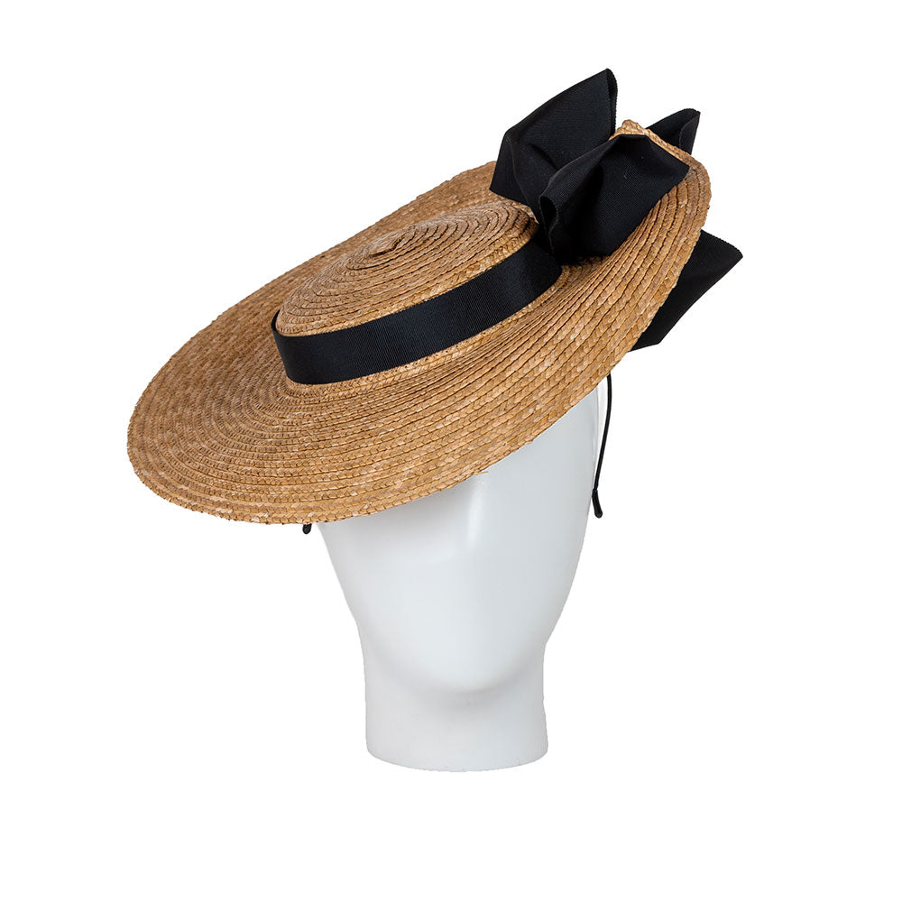 Our smaller-sized boater design, blocked in finest natural straw, and trimmed with neat petersham ribbon bows. Contact our design team for custom colour options.
