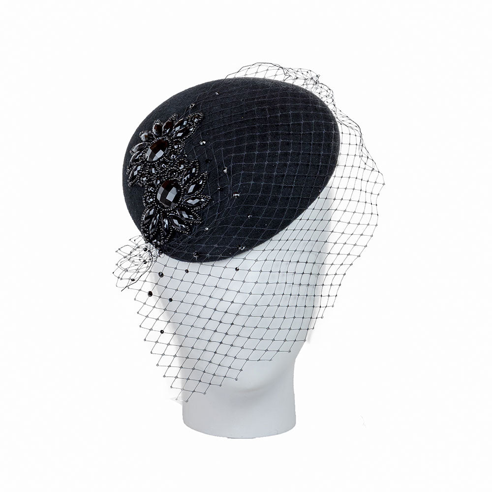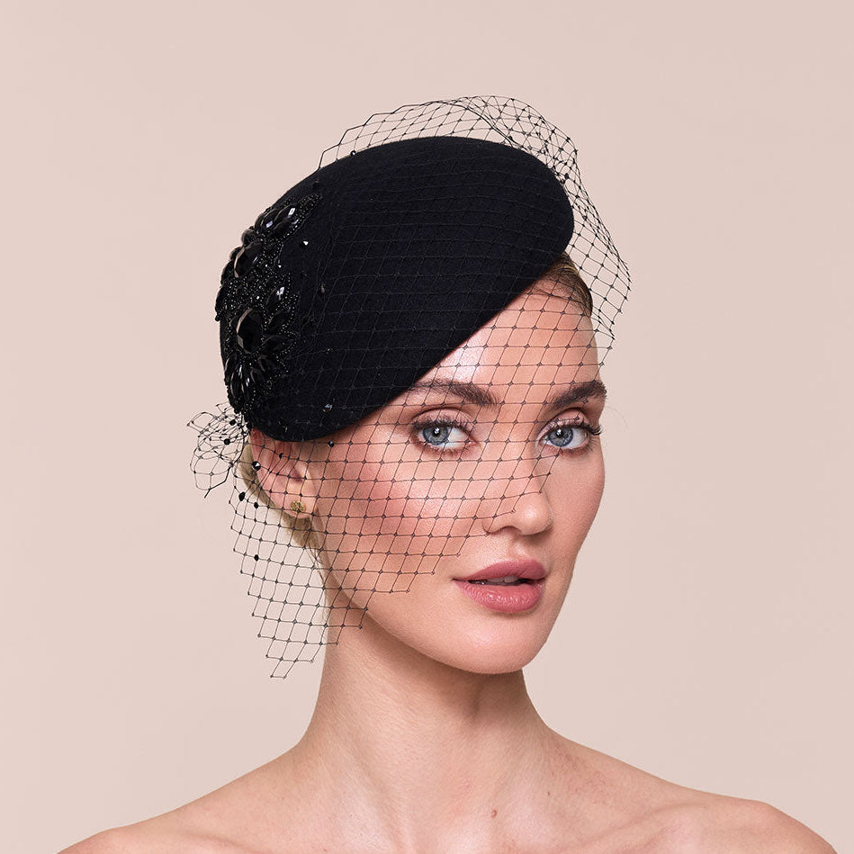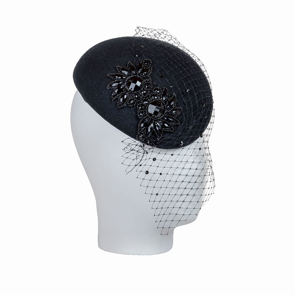 A perfect little beret style to suit most face shapes. Blocked in a sumptuous wool felt and trimmed with asymmetric veiling over the face, finished with a beaded motif and Swarovski crystals to add a subtle shimmer.