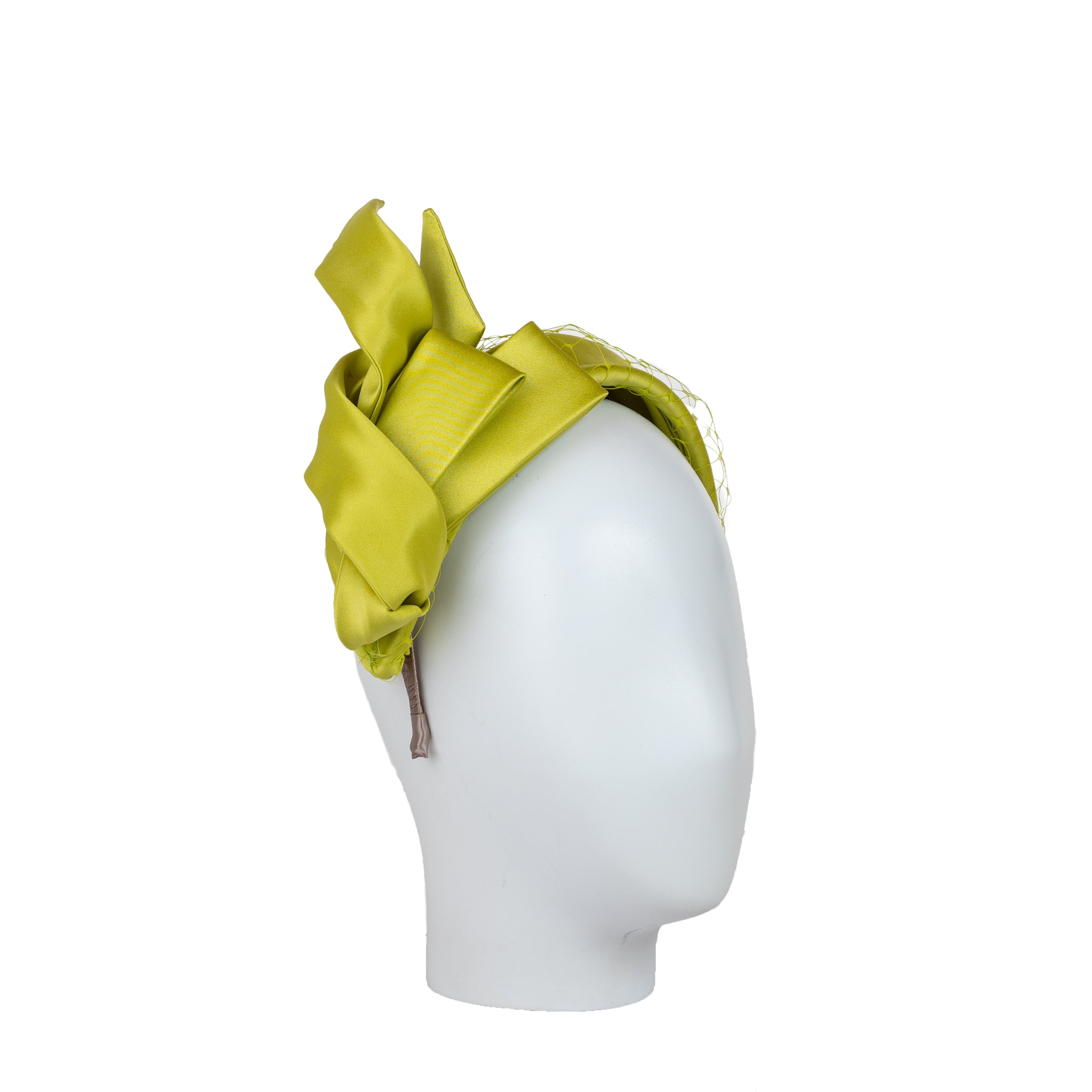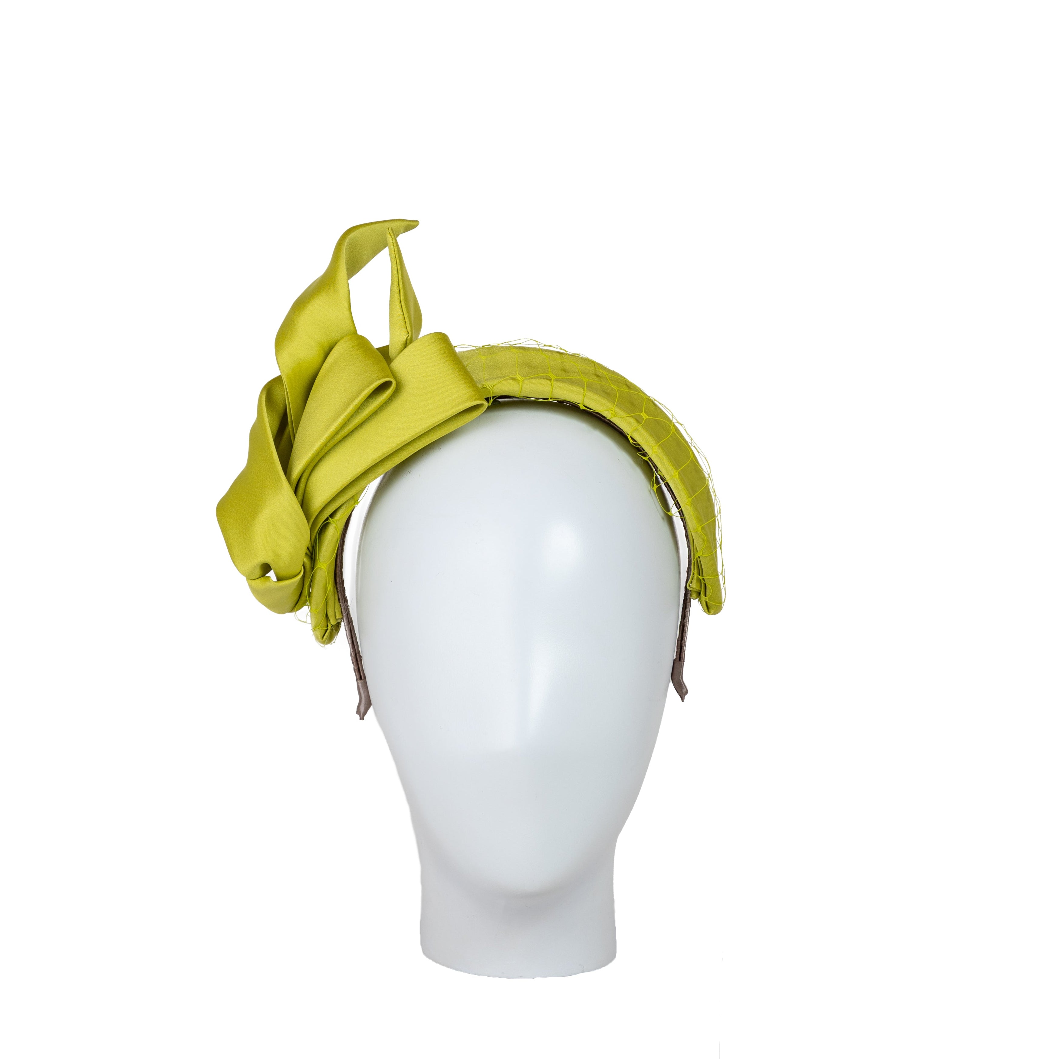 A neat headband style headpiece featuring an Ascot Royal Enclosure-approved blocked base, and trimmed with a wired bow made of sumptuous satin and merry widow veiling.