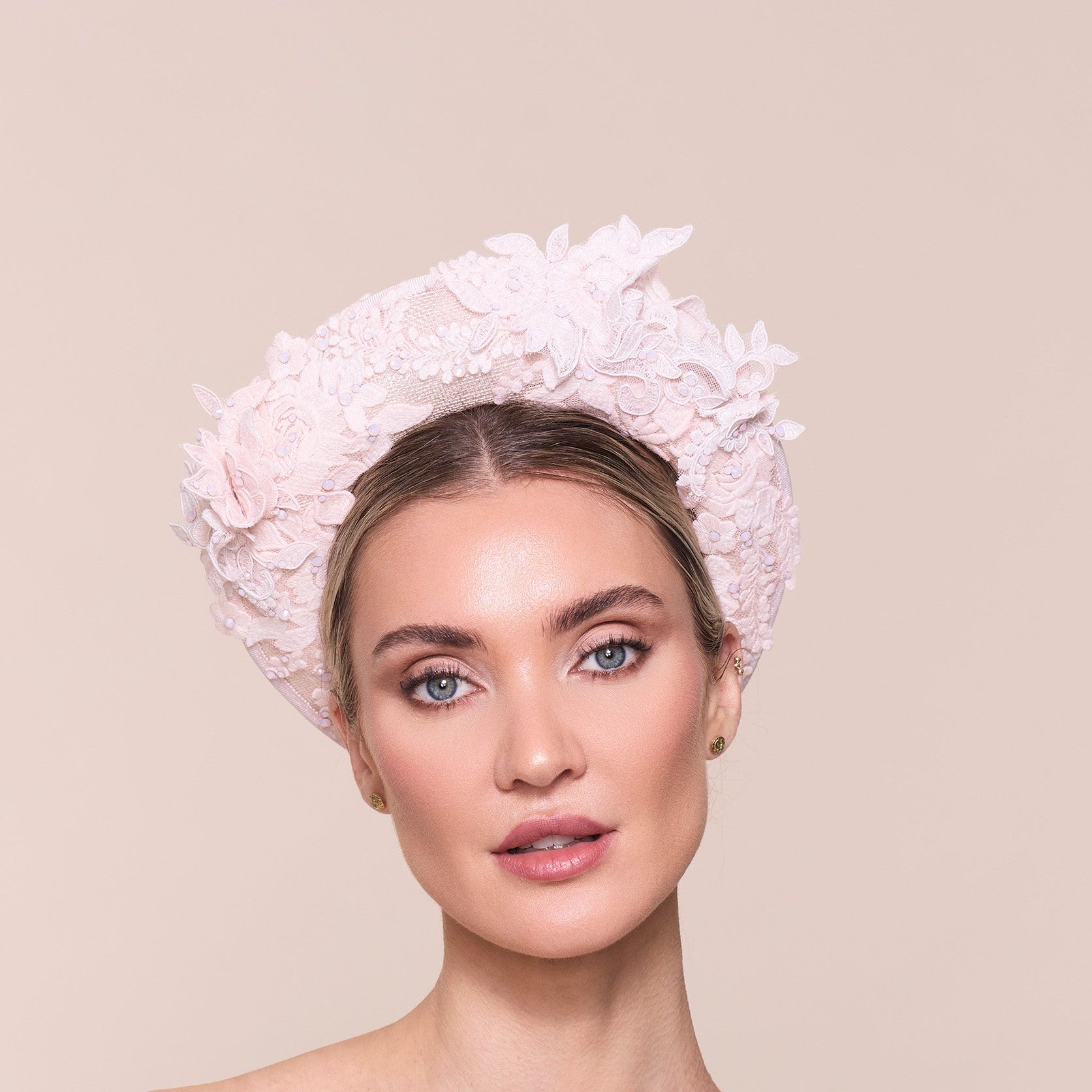 Elegant and easy to wear, this blocked sinamay headpiece features a halo crown style trimmed with a cascade of lace applique and flowers. Finished with a sprinkling of Swarovski crystals. of ostrich quills. A perfect piece for garden parties, wedding guests, and summer events.