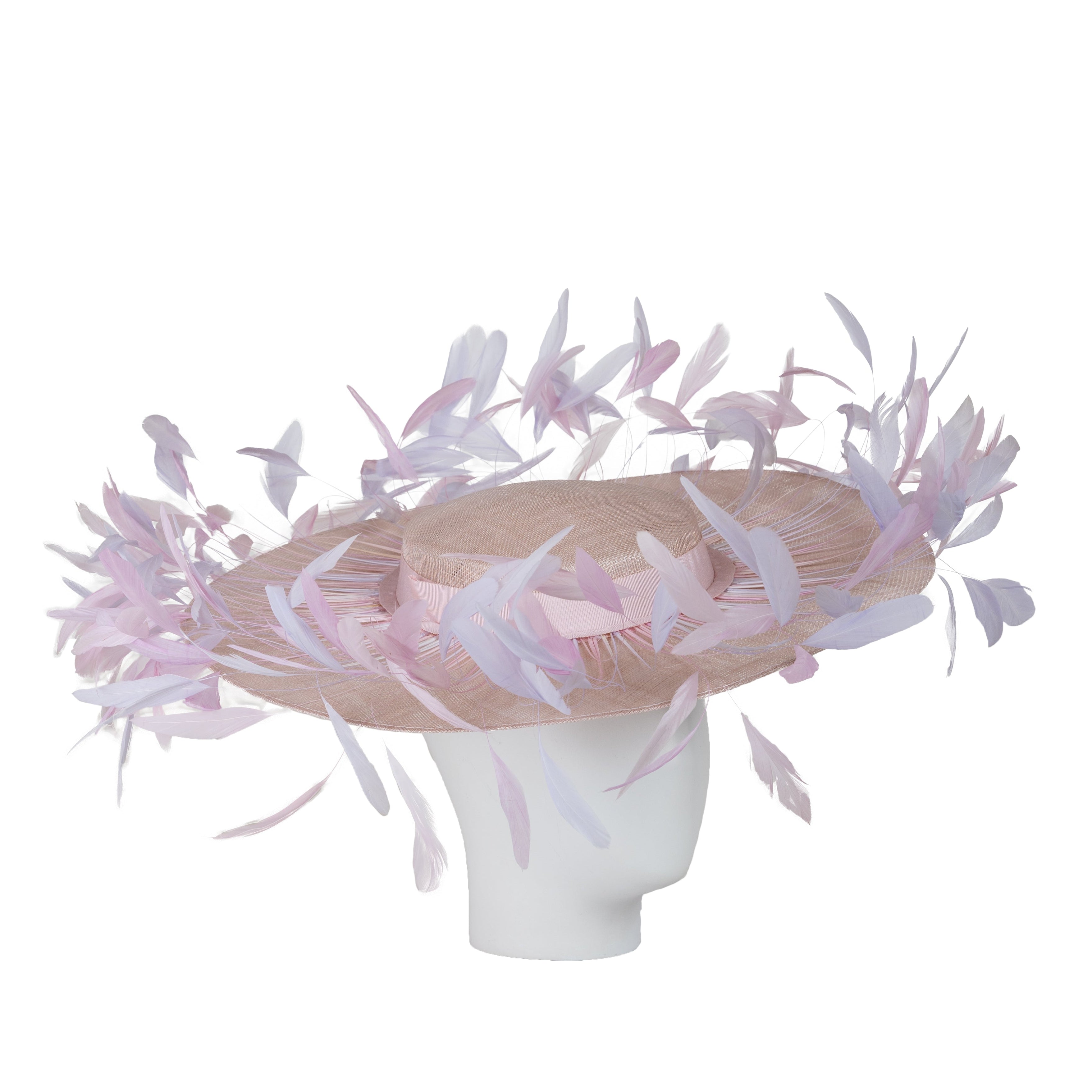A blocked sinamay boater-style hat, trimmed with elegant, long, coque feathers in mixed pastel tones. So comfortable to wear and lightweight, this piece is perfect for a day at the races- whether it be Royal Ascot or Kentucky Derby. Mothers of the Bride or Groom would look feminine and demure in this Blush hued headpiece, or of course have this style custom made to colour match your outfit for a truly bespoke outfit.