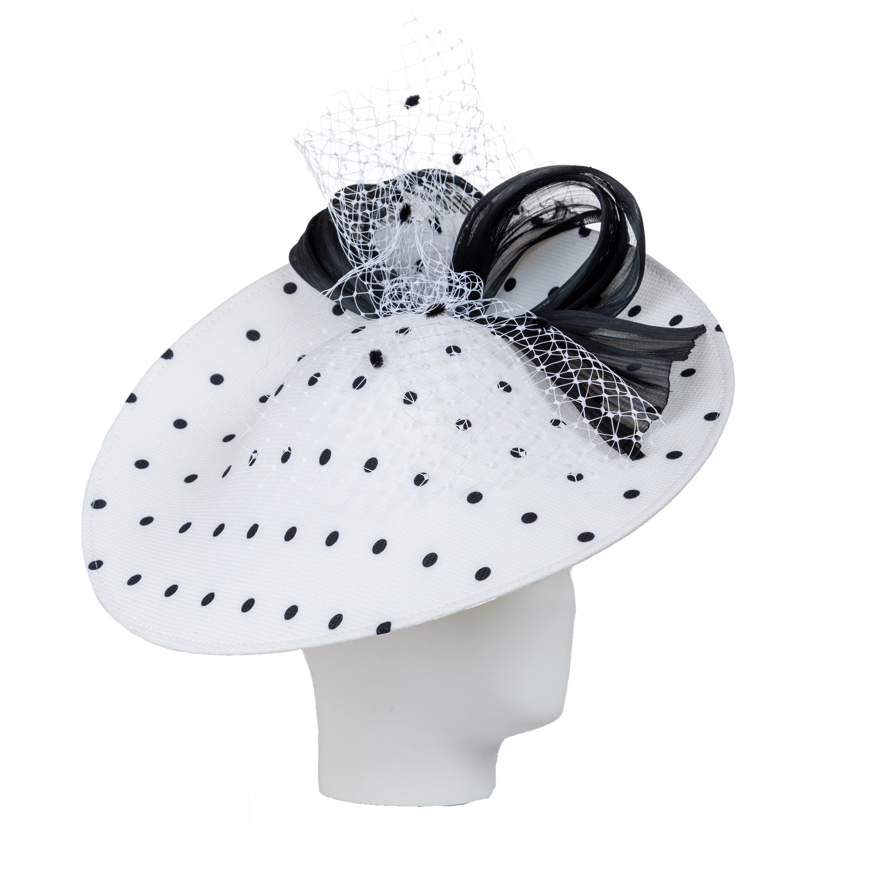 Our classic mid-size disc, blocked with a polka dot fabric top layer and trimmed with black silk abaca bows and finished with flocked spot veiling to carry on the polka dot theme and add delicate height.